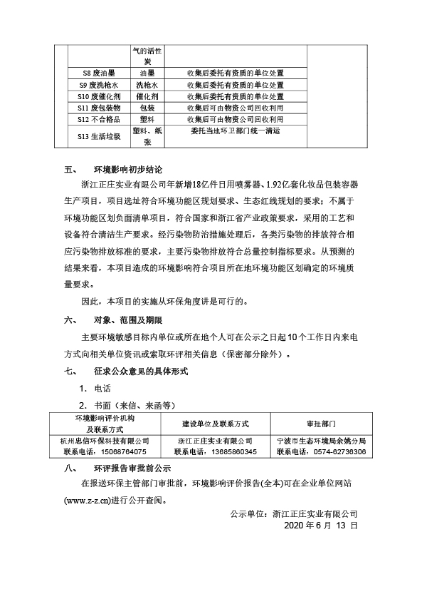 浙江正庄实业有限公司年新增18亿件日用喷雾器、1.92亿套化妆品包装容器生产项目